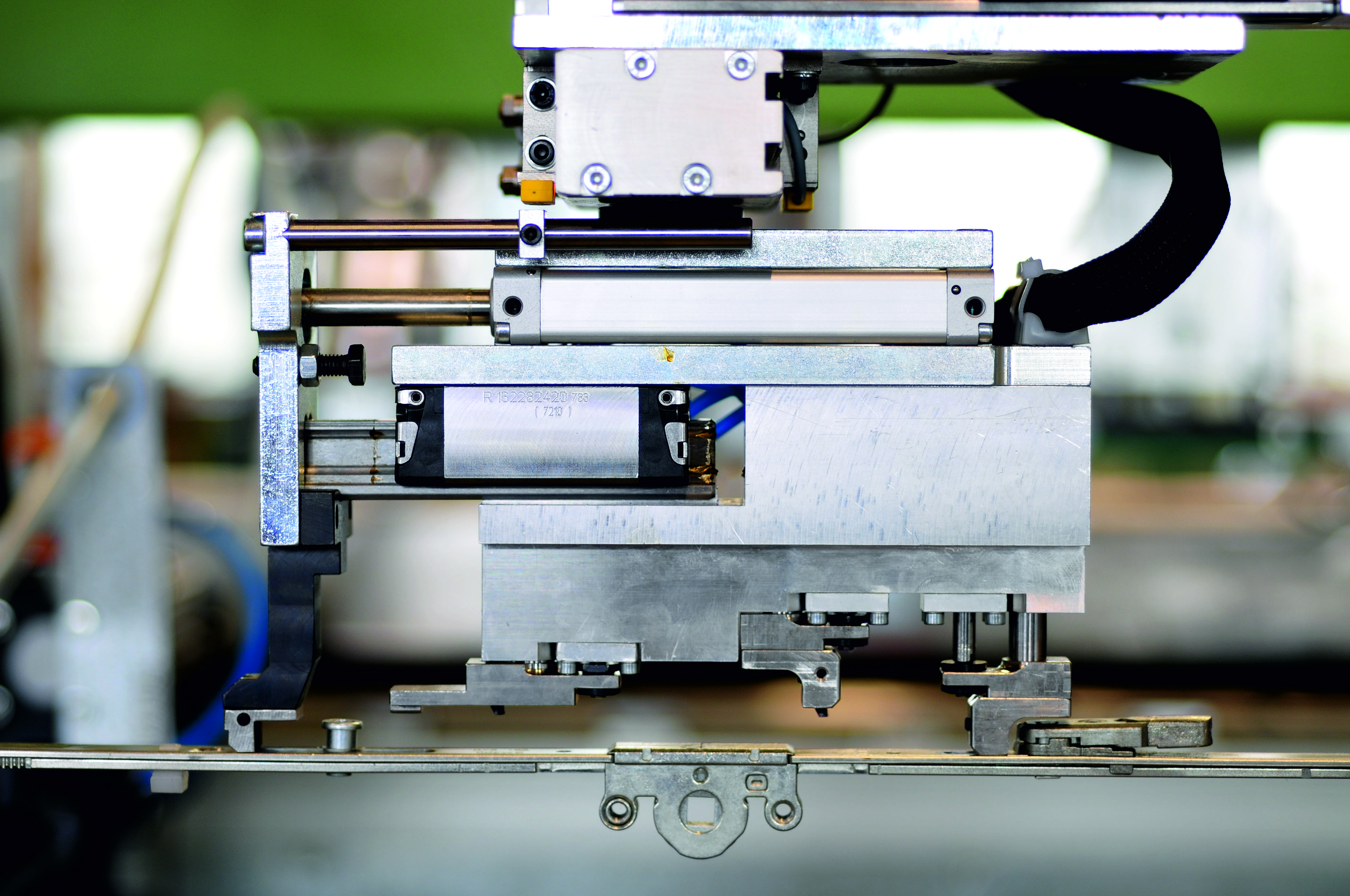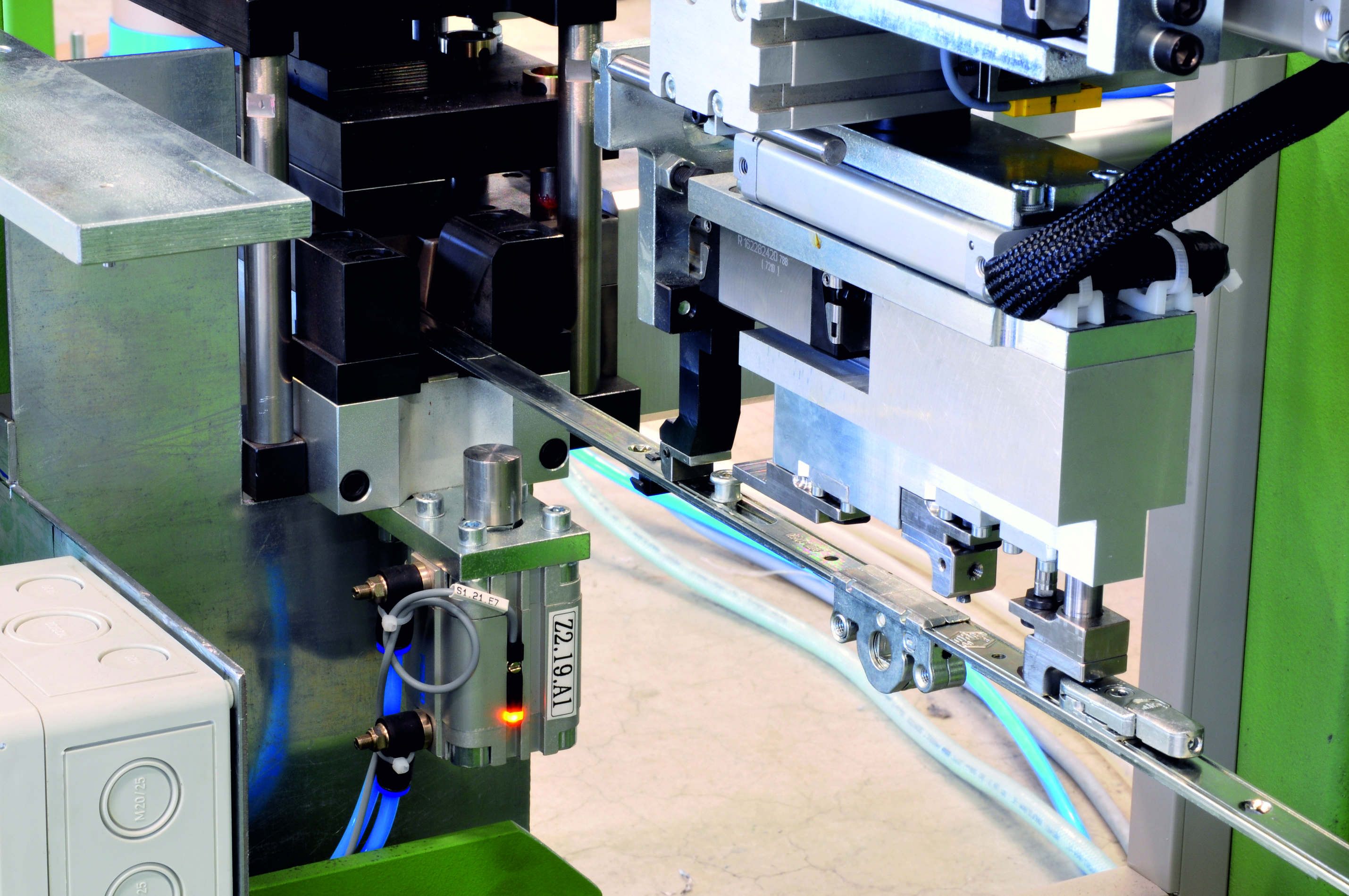 Wurden bisher Langteile von Hand gekürzt, so erfolgt dieser Arbeitsgang auf dem Montagecenter vollautomatisch. Das Greiferhandling entnimmt dem Magazinschacht das abzulängende Beschlagteil und führt dieses ohne vorheriges Aufspreizen in die Stanze ein. Hochgenaue NC-Achsen fahren den Beschlag im Werkzeug auf das von der Steuerung vorgegebene exakte Ablängmaß. Das Beschlagteil wird präzise abgelängt und geprägt.