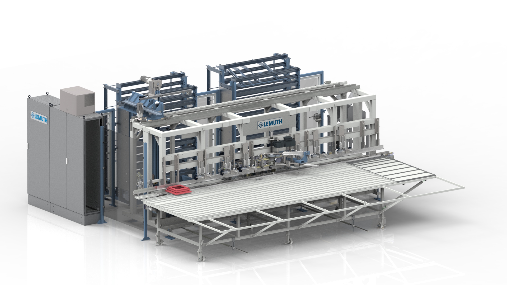 Eine Abstapeleinrichtung schließt die vollautomatische Flügelbeschlagmontage ab.