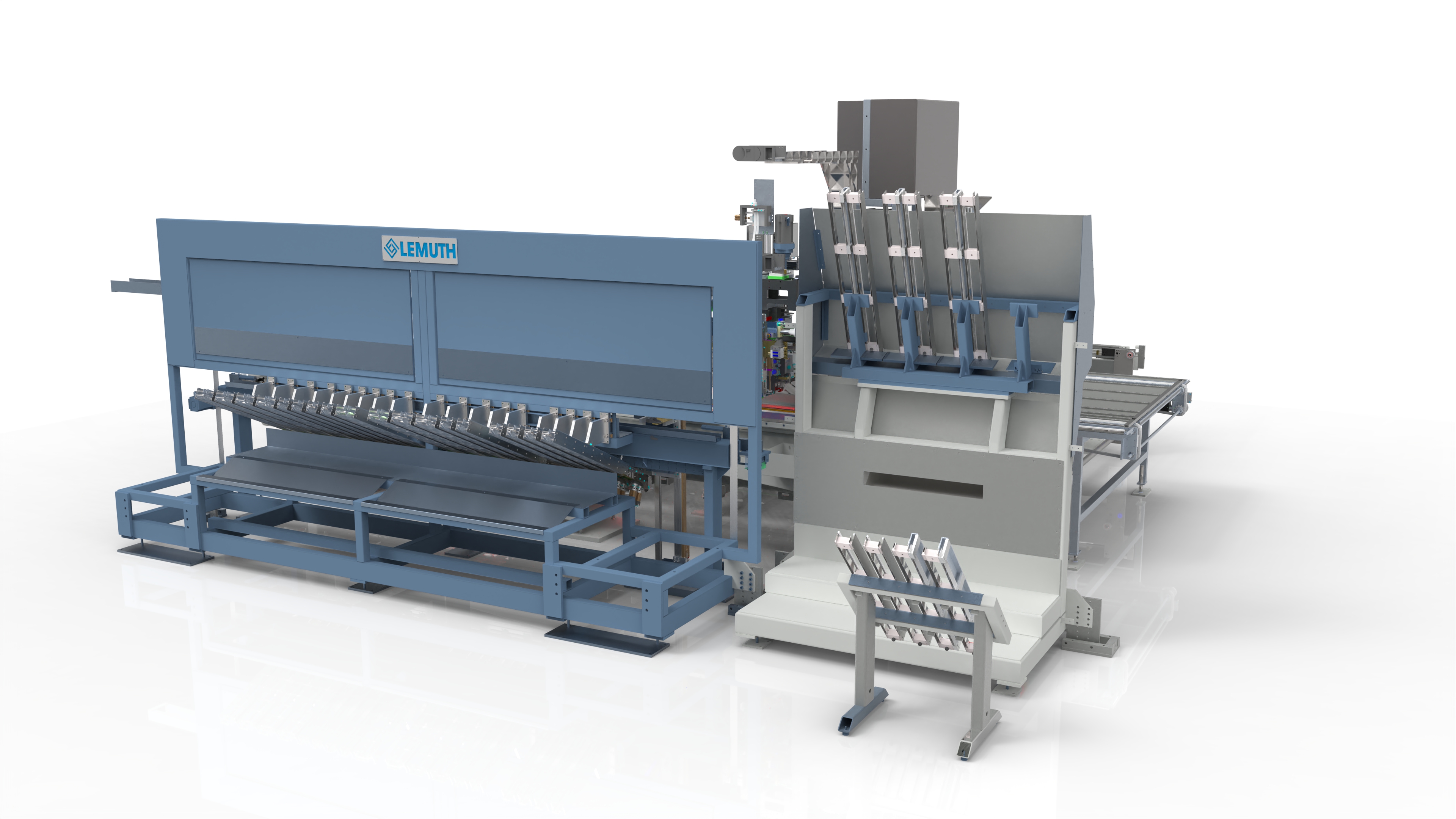 Die Magazine können wahlweise vor oder hinter der Maschine angeordnet werden. Serienmäßig ist auf der Anlage die Verarbeitung vom maximal 4 verschiedenen Lagern und 12 verschiedenen Schließteilen möglich.
