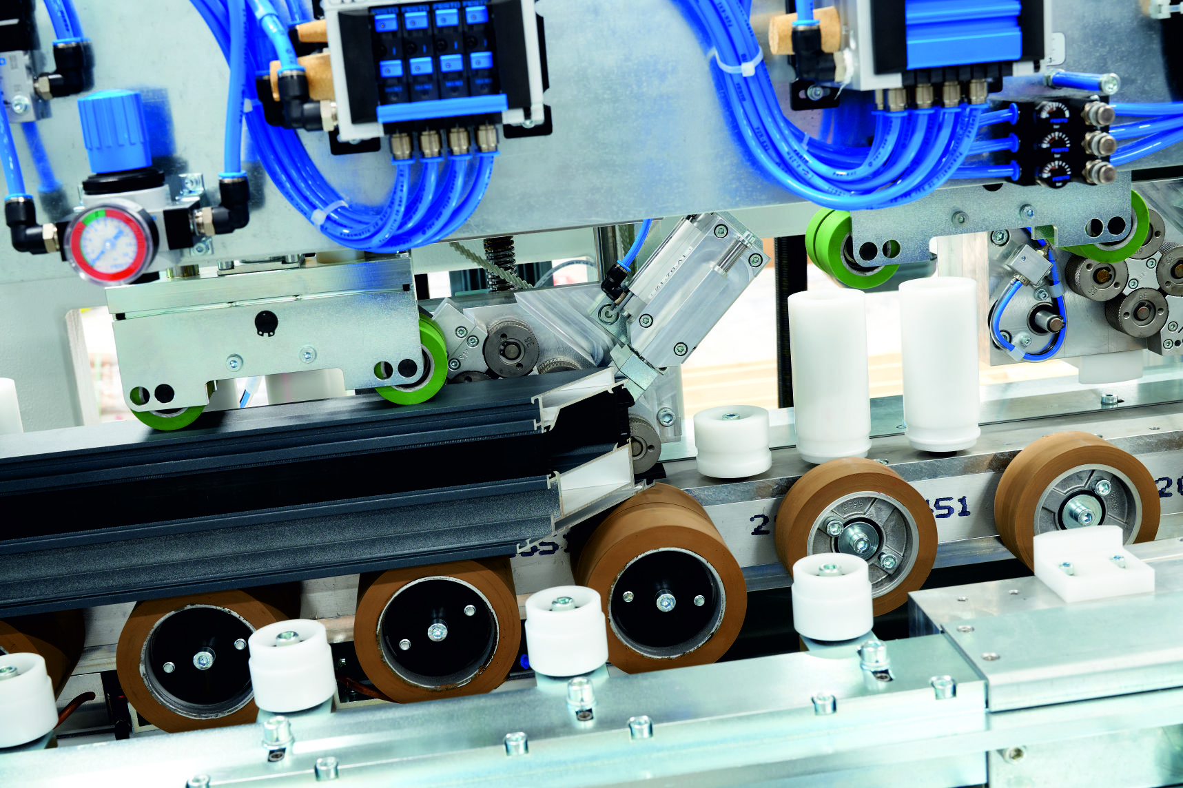 Je nach Bedarf lassen sich ein oder mehrere Dichtungsgummis gleichzeitig einbringen. So erfolgt bei Flügelprofilen die Montage von Glas- und Anschlagdichtung in einem Durchlauf. Auch bei Kämpferprofilen werden beide Dichtungen gleichzeitig montiert. Dabei arbeitet jedes Einziehaggregat mit den für die jeweilige Dichtung extra eingestellten Parametern.