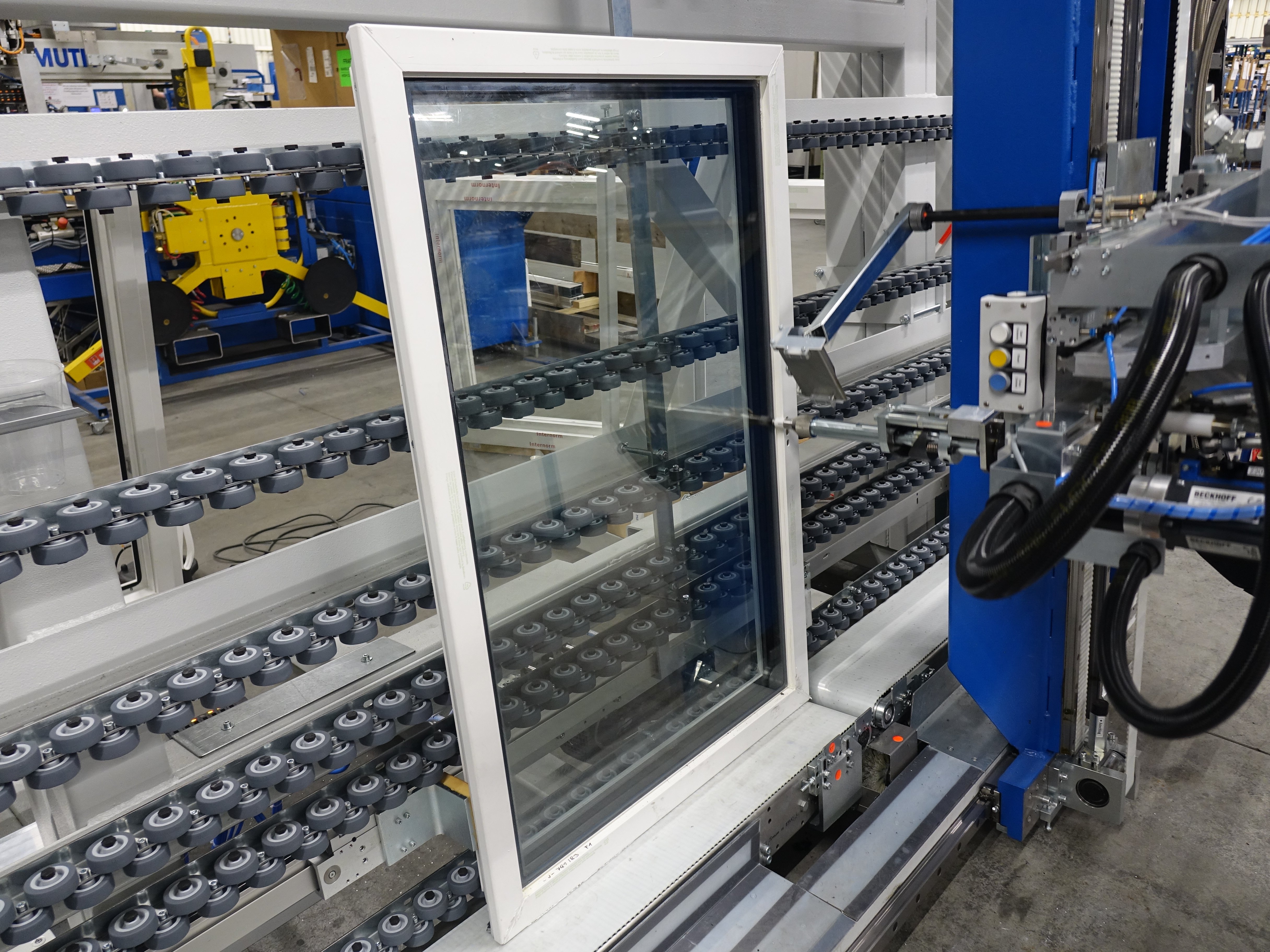 Nachdem der Bediener auf dem vorgelagerten Eintransportgestell die Scheibe in den Flügel des fertig montierten Fensters eingesetzt hat, übernimmt die Anlage das Fenster zur Bearbeitung. Einzeln angetriebene Transportbänder an der Anlagenunter- und Rückseite gewährleisten einen schonenden Elementetransport. Vor dem Verkleben erfolgt das automatische Spannen des Fensterelementes gegen die Rückwand des Automaten. Der Klebstoff wird umlaufend zwischen Glasverbund und Flügelfalz eingebracht. Nach dem Applizieren werden die Fensterelemente aus den Automaten austransportiert. Anschließend erfolgt die Montage der Glasleisten. Schon kurz danach ist der schonende Weitertransport des Fensterelementes möglich.