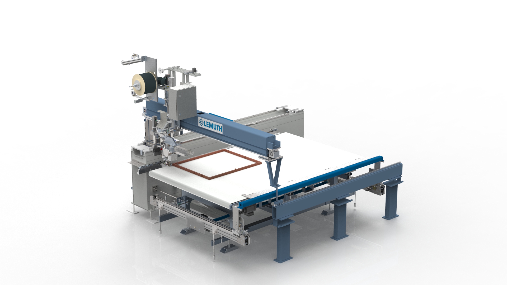 Mit diesem Montageautomaten werden Klebebänder auf Glasscheiben, die später in Flügelrahmen eingeklebt werden, aufgebracht.