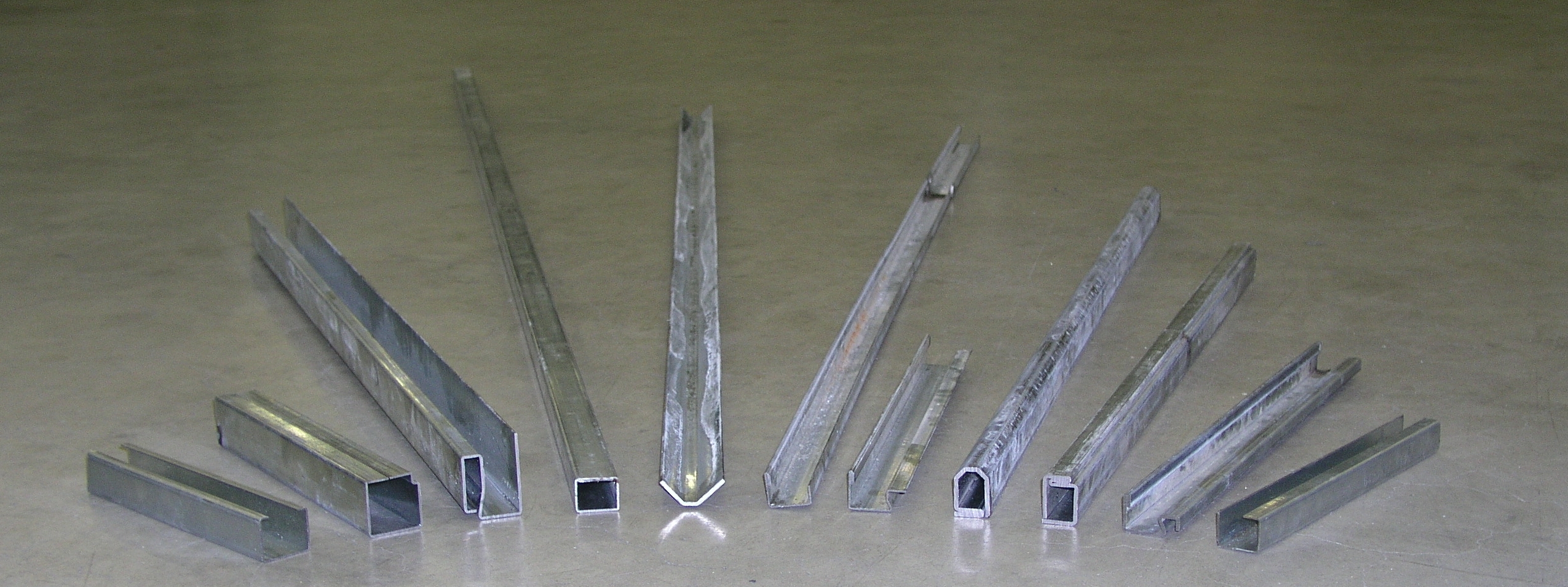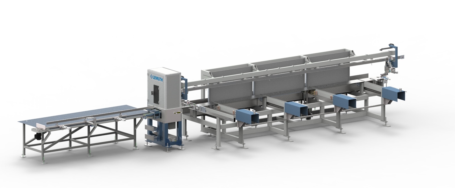 Die auf der Profilauflage bereitgelegten Stahlprofile werden in die Einlaufrinne gefördert. Hier fasst eine Greiferachse den 6-m-Stahl und schiebt diesen auf das jeweilige Ablängmaß in die Zuschnitteinrichtung ein. Das Ablängen der Stahlprofile kann mittels leiser Stanze oder Sägeeinrichtung erfolgen. Für die Verarbeitung unterschiedlicher Profilformen ist die Ausführung der Stanze mit automatischem Schneidplattenwechsel möglich. Für die Ablage der zugeschnittenen Armierungsstäbe ist ein Ablagetisch vorgesehen.
